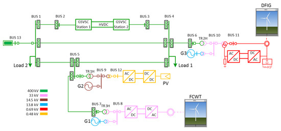 - Two lines has been used to test the faults: Line 5–7 for Type 4 WT current contribution and line 4–5 for PV generator current contribution (see Figure 2).