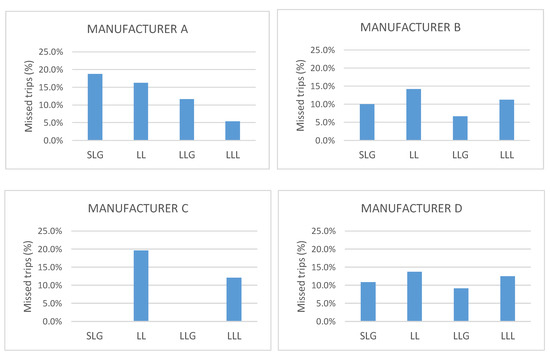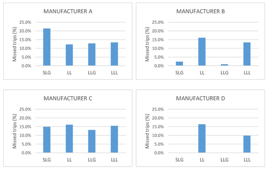 Figure 3 and Figure 4 represent the percentage of missed trips of distance protection of each manufacturer installed in line 5–7 and line 4–5 respectively. Each graph represents one of the four commercial protections analyzed, which have been named as Manufacturer A, Manufacturer B, Manufacturer C and Manufacturer D, before different types of fault. One of the first features that draws attention is the difference between the behavior of the same protection against fault currents from PV current contribution or from Type 4 WTG current. The reason for this is that solar generator control acts faster than Type 4 WTG. Comparing behavior of each protection device before different fault type, it is observed that Manufacturer A missed trips increase in SLG and LL faults, Manufacturer B shows more difficulties with LL and LLL faults than for faults that involves the ground element. It is very interesting to see that detecting faults involving ground is not a problem for distance protection algorithm of manufacturer C, showing a clear difference of behavior regarding to the other three vendors. However, this protection relay shows the biggest number of failures in tripping decisions for LL faults and not negligible missed trips for LLL. The distance protection algorithm of manufacturer D presents a similar behavior than protection relay B, with a worse behavior at LL LLL faults and slightly better, but with a non-negligible number of missed trips, for faults involving ground. The statistics of the tests appear in Figure 3 and Figure 4 [22,23].