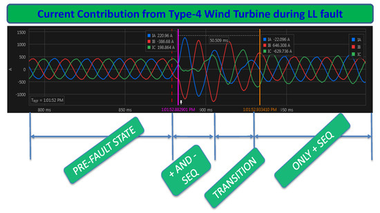 Both analyzed generators, Type 4 WT and PV, are coupled to the grid through a converter, so that, current contribution performance during faults depends on their control. Therefore, the analysis and conclusions from this section can be applied to both of them. As an example, Figure 5 shows current injection from a Type 4 WT before and after a LL fault. In this figure, different stages have been indicated depending on the behavior of the current before and during the fault. These stages are: