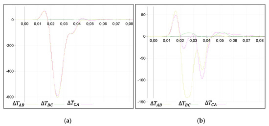 Hence, AG fault results can be observed in Figure 6. Figure 6a represent the SG behavior and clearly shows that results from SG fulfill the expected relationship between scalar products from Table 1: and . Regarding directionality, it is clearly forward because, observing the evolution of the curves, the negative peak is one order of magnitude larger than the positive one. Criterion from [20] is less restrictive and is also fulfilled. Similar analysis can be applied to AB fault, shown in Figure 7a and Figure 8a. Figure 7a shows agreement of the results with Table 1 criterion for AB faults since and negative peak value is one order of magnitude higher than positive peak and the three scalar products have the same sign during the test, so there is no doubt about the forward directionality and phase selection. Finally, Figure 8a scalar products applied to SG current contribution during the fault accomplish the relationship correctly.