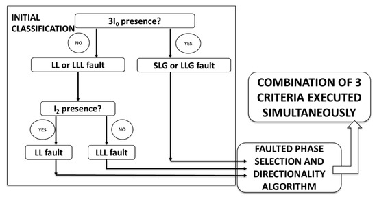 The proposed algorithm starts when unbalanced fault conditions are detected at the protection measurement point. This detection is accomplished by comparing negative and positive sequence currents and zero and positive sequence currents. Initial thresholds used for fault classification are set at 10% (negative vs positive and zero vs positive sequence currents) and they could be adjustable by the user.