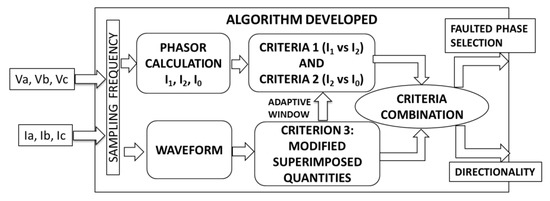 According to the results summarized in Section 3, renewable generators connected through PE, such as Type 4 WT and PV systems, behaves similarly to SGs during the first instants after the fault inception, but once control system reacts the negative current contribution to the fault is eliminated. Due to this behavior, it was observed that present faulted phase selector and directionality algorithms show a wrong performance. This is the starting point of the proposed algorithm.