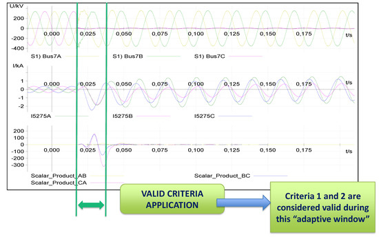 Waveforms coming from the output of scalar products definition based on superimposed quantities theory contains the information to define the adaptive window in which the information from criteria 1 and 2 is valid. In this step, maximums and minimums of the waveforms generated by these scalar products are used to define the start and end of the adaptive window.