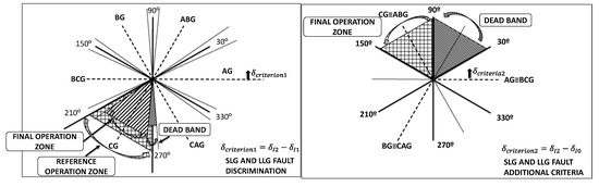As it can be observed in Figure 12, AG and BCG faults share the sector 330° to 30°, CG and ABG faults share the sector 90° to 150° and finally BG and CAG faults share the sector 210° to 270°. In this case, sectors 30° to 90°, 150° to 210° and 270° to 330° are non-used sectors and considered as dead-band sectors as can be noticed in the picture. Figure 13 shows an application of this criterion for a CG fault, where δcriterion2 is between 90° and 150°.
