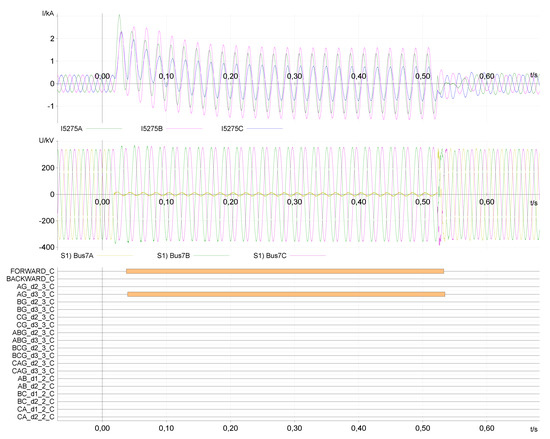 Figure 15 shows the oscillography obtained by the developed algorithm in an AG fault at line 5–7 at the 70% of the line length with a fault resistance of 0 Ω and with a total installed generation of 200 MW. As it can be seen in the bottom of the figure, the proposed algorithm is able to obtain the correct faulted phases and directionality.