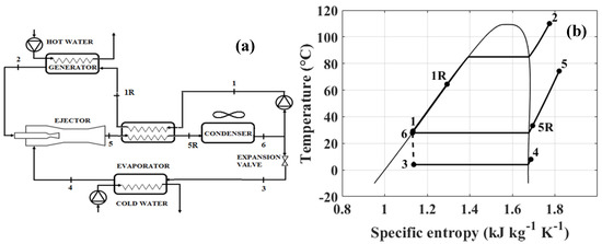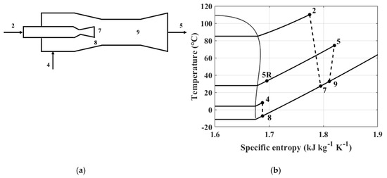 (a) Schematic layout. (b) Example of an ejector cooling cycle on T-s diagram for the fluid R1234ze.