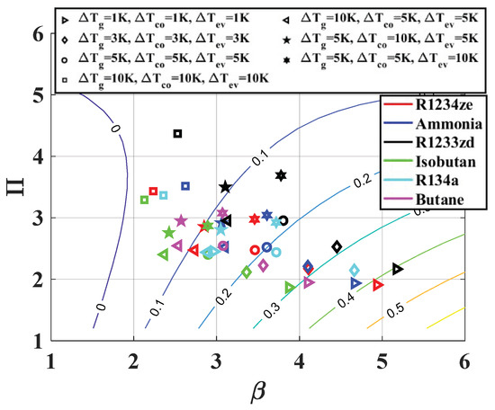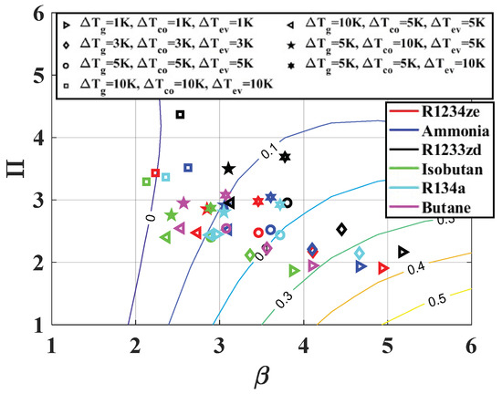 Figure 4 shows the entrainment ratio µ map as function of the β ratio and pressure lift Π. The main objective of the following figures is to present the general trends as a function of the operating conditions indicated in the corresponding legends. Considering the working fluid R134a, the configuration with 1 K of pinch point for all heat exchangers was excluded since the temperature exceeded the critical value of 101.1 °C. The refrigerant R1233zd is characterized by higher values of Π and β due to lower saturation pressure at fixed temperature with respect to the other investigated fluids.