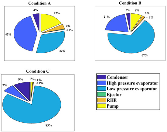 Regarding the refrigerant effect, although economically penalized by toxicity and flammability issues, the investigated solutions using ammonia as working fluid are those falling in the lowest specific investment cost region, due to a very high latent heat and its particularly favorable thermodynamic and transport properties for two-phase heat transfer. The opposite situation is observed for the synthetic refrigerant R1233zd(E), that presents higher specific set-up costs with respect to other refrigerants when the same boundary conditions are applied. For the present analysis, three singular solutions (namely A, B, and C), chosen as possible “optimum” cases, are extracted from the total set of simulations and the related main parameters are summarized in Table 6. The share of the total investment costs for these configurations is specified in Figure 7. Specifically, solution A provides the plant configuration with the lowest specific investment cost of 0.40 k€ per kW of cooling load. Almost half of the entire cost (42%) is related to the high-pressure evaporator, followed by the low-pressure evaporator (32%), the electric pump (17%), and the fin and tube condenser (4%). This configuration uses ammonia as refrigerant, with a pinch point of 1 °C at the condenser, with a minimum temperature difference of 7 and 10 °C in high- and low-pressure evaporator, respectively, and an efficiency of the regenerative heat exchanger of 0.50. The related COP is however low (0.21) caused by a reduced entrainment ratio of 0.227. From another perspective, solution C maximizes the system performance, with a COP of 0.40, using R1233zd(E) as refrigerant, all the minimum temperature differences set to 1 °C, and the internal heat exchanger efficiency of 0.50. In contrast, the specific set-up cost is very high (3.13 k€ kW−1), due to the penalized heat transfer efficiency for this low reduced-pressure fluid, that leads to large required heat transfer surfaces. In fact, approximately 99% of the total specific costs are attributed to the heat exchangers (see Figure 7). Finally, solution B represents the reasonable trade-off between low investment costs and high system performance. The corresponding set-up cost is 0.80 k€ kW−1, significantly lower than that of solution C, with only a slight penalization on the COP value, equal to 0.39. For this configuration, ammonia is the working fluid and all the pinch point values are set to 1 °C, with an efficiency of the internal plate heat exchanger equal to 0.50.