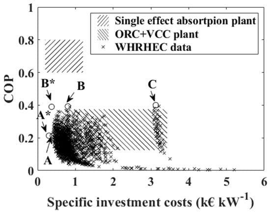 System performance and specific investment costs range of organic Rankine cycle (ORC) + vapor compression cycle (VCC) and single effect absorption plant. Highlighted solutions: A (minimum cost), C (maximum performance), and B (best compromise between cost and COP). Asterisk solutions A * and B * refer to plate heat exchanger type at the low-pressure evaporator instead of a shell and tube heat exchanger.