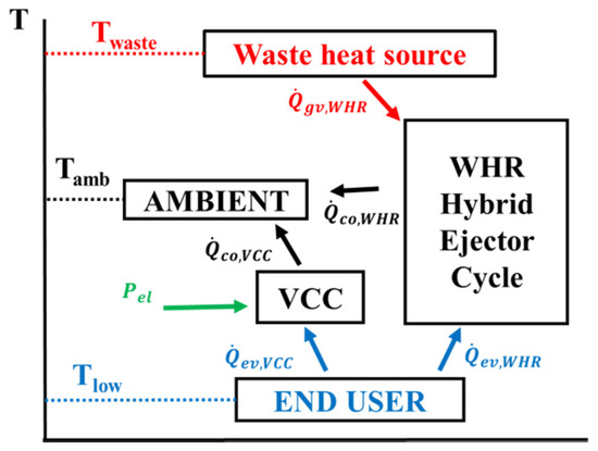 Schematic diagram of a combined waste heat recovery hybrid ejector cycle (WHRHEC)/VCC system to supply the end user cooling load.