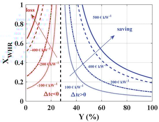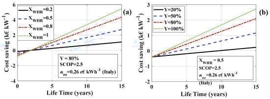 In Equation (11), kWHR and kVCC are the set-up specific costs (k€ kW−1) of the WHR and the VCC plant, respectively. Particularly, kWHR refers to the optimal solution B of the previous section and is therefore considered equal to 0.80 k€ kW−1 in the present analysis. and are the cooling capacities of the two systems, whereas κee is the specific cost of electric energy (k€ kWh−1). The VCC plant is most likely designed to fulfill the entire cooling load, in order to satisfy the user requirements also when the waste heat recovery mode is not available. The parameter XWHR defines instead the fraction of the cooling load covered by the WHR plant.