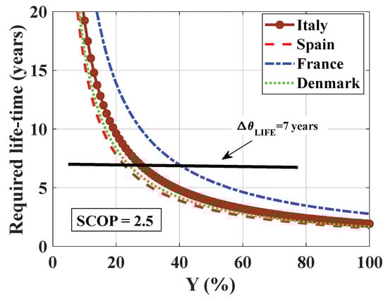 The electric energy consumption Eel in the system lifetime ΔθLIFE is then required only when the waste heat recovery system is not used and is a function of the seasonal COP (SCOP) of the VCC cycle. By defining ΔθWHR as the period of the lifetime in which the waste heat source is available, the electric consumption reads as: