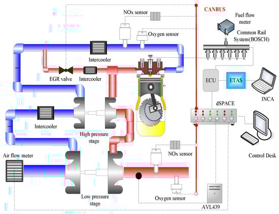 Primarily, Figure 1 shows a schematic diagram of the measurement and control system in the experiment. As shown in Figure 1, a high-pressure EGR was selected for the experiment. First, the exhaust gas is extracted before the high turbine (turbocharged, that is, increased air intake). The exhaust then passes through an EGR cooling unit (to cool the exhaust) and an EGR valve (to control the exhaust flow). Finally, the exhaust is directed behind the compressor.