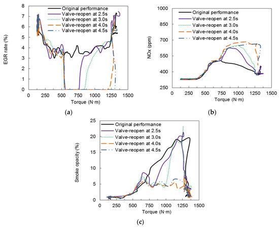 Effect of different EGR valve-reopen time on diesel emission performance: (a) EGR rate; (b) NOx; (c) Smoke opacity.