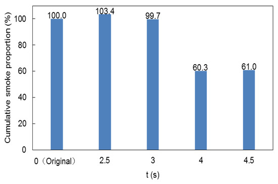 We obtained data by implementing multiple sets of experiments (3 sets), and finally, only one set of experimental data was selected for analysis and discussion. Through the above analysis, we use Figure 6 to show the effect of different EGR valve-reopen times on transient emission performance, and Figure 7 to show the effect of different EGR valve-reopen times on cumulative smoke proportion. Here, 2.5 s, 3.0 s, 4.0 s and 4.5 s represent EGR valve-reopen time. As shown in Figure 6, as the EGR valve opens again, the EGR rate increases rapidly, because the concentrated mixture rate increases in-cylinder, so the NOx emission decreases obviously and smoke emission appears the second peak. When setting the valve-reopen time at 4 s, compared to the original performance (fixed valve opening), the reduction of smoke opacity peak is 64.4% (from 19.4% to 6.9%), and the increase of NOx is 34.9% (from 506 ppm to 683 ppm). Moreover, the cumulative smoke gets the best optimization (60.3%) to reopen EGR valve at 4.0 s. In addition, the later the EGR valve-reopen time is, the better the thermodynamic state are and the air inflow delay is well improved, so the smoke opacity peak is lower.