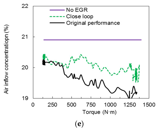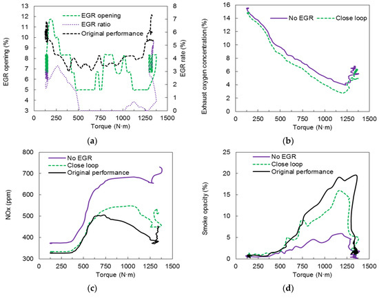 As shown in Figure 8, the black line represents the EGR rate at different torques at a fixed EGR valve opening, and the green and purple lines represent the EGR valve opening and the corresponding EGR rate under different torques under the EGR control strategy used in this paper. The change of the EGR rate is similar to the open loop control strategy under the closed loop control strategy. They all reached 0 in the middle stage of the transition process, so compared to the original performance, the peak smoke opacity was reduced by 18.6% (from 19.4% to 15.8%), and NOx emissions were increased by 8.3% (from 506 ppm to 548 ppm). From Figure 9, there exists deviation degree between the target valve and test valve. Firstly, in the close loop control strategy, the PID controller calculates and revises the deviation between the target value and test value, and then it controls the opening of the EGR valve, which exist a time delay during the process. Secondly, the change of EGR opening exists as a delay. These two reasons cause the exhaust oxygen concentration under the close loop control strategy which cannot completely follow the target exhaust oxygen concentration. In addition, the EGR valve changes frequently in the late stage, so the deviation degree is larger in the late stage of transient process. Compared with no EGR, NOx emissions are reduced, with a peak of 548 ppm, but the peak value of the smoke opacity is higher.