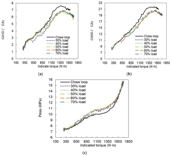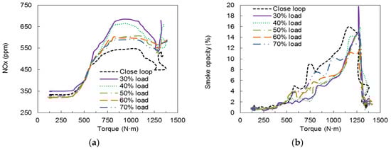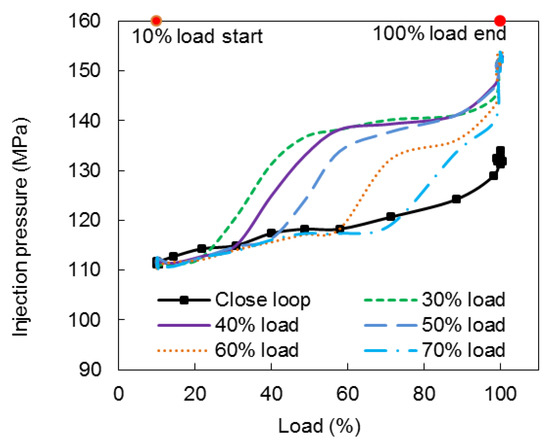 Figure 10 shows the test plan. First, we select a turning point load, and keep the injection pressure at the original pressure before the turning point load, then increase the injection pressure by 20 MPa. For example, “30% load” means that the injection pressure is increased by 20 MPa after a 30% load, and the performance is compared with the closed-loop performance (a closed loop control strategy based on the exhaust oxygen concentration).