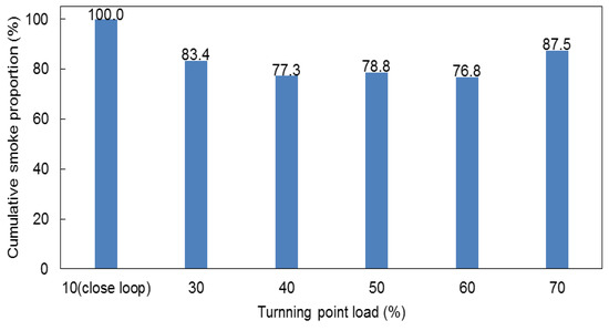 As can be seen from Figure 11 and Figure 12, after turning point load, the SSRP strategy resulted in an increase in Pmax (maximum cylinder pressure), and both CA10 (crank angle position with combustion mass of 10%) and CA50 (crank angle position with combustion mass of 50%) were advanced. Increasing injection pressure can reduce the duration of fuel injection, which increases the air-fuel mixing energy. So the fuel beam movement speed, the air disturbance and the broken, atomized, and evaporated oil droplets are elevated. Furthermore, the increased energy promotes the formation of homogeneous mixture, so the combustion ratio increases and the combustion is more complete. As can be seen from Figure 11b, when 40%, 50%, 60%, and 70% are selected as the turning point loads, the peak value of the opacity of the smoke can be effectively reduced. In addition, the maximum drop rate reached 31.8% If the cumulative smoke ratio increases the injection pressure after 60% load, it reaches 76.8% (according to Figure 13). And here we investigate the reasons. First, when the turning point load is increased during the transition operation, the exhaust gas energy and the turbocharger speed are both high, thereby reducing the intake delay. Moreover, under small loads, increased rail pressure may cause “wall wetness”. For the above reasons, we temporarily select 60% load as the best SSRP strategy.