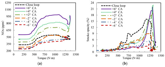 Based on the above results, both CA10 and CA50 are advanced because of having the injection timing ahead. It is helpful for the completeness of combustion and homogeneous mixing of fuel and air, resulting in more constant volume combustion, so the NOx emission increases. However, the fact of the increasing smoke opacity does not conform to the theory that advancing the injection timing can improve the combustion. Therefore, it is not sufficient to analyze the smoke emissions only during the combustion process. First of all, considering that the shape of the experimental diesel combustor is bendable, compression at the top center will form strong turbulence. This promotes uniform mixing of fuel and air. We should notice that the advance of the injection timing causes combustion to start before the top dead center. Secondly, due to the advancement of injection timing, the combustion temperature decreases during the later stages of the combustion process, which will prevent subsequent oxidation of the flue gas. Third, the early spray time may cause “wall wetting” phenomenon. Therefore, we chose “−6° CA” as the optimal injection timing. Under the “−6° CA” strategy, compared with the closed-loop control strategy, the maximum reduction in NOx reached 28.2% (from 532 ppm to 382 ppm), the peak value of smoke opacity was 3.8%, and the reduction reached 80.4%.