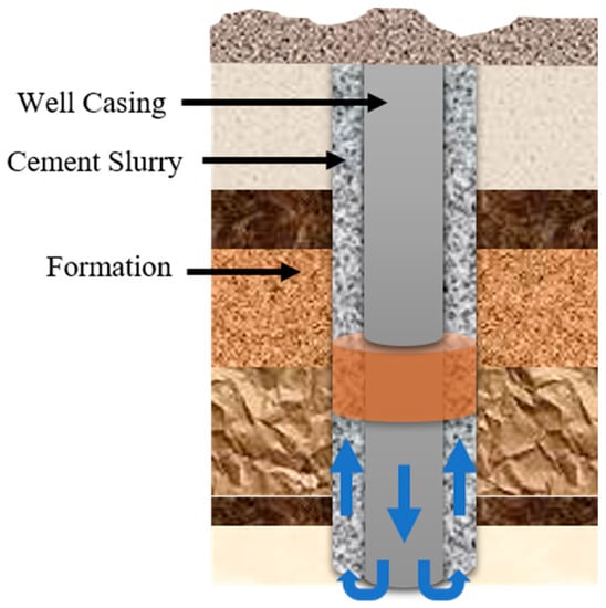 In cementing operations, different cement slurries including “lead” slurries at the upper section and “tail” slurries at the lower section are pumped into the wellbore, as shown in Figure 2. The tail slurries, under higher pressures and temperatures, usually have higher density and higher strength than the lead slurries and are pumped after the lead slurries [17]. Portland cement is widely used in the oil well and construction industries because of its flexibility and widespread availability of its constituent materials [18]. It is produced from the grinding of clinker, which is produced by the calcination of limestone and other raw materials in a cement rotary kiln. After the cement is mixed with water, a series of exothermal chemical reactions occur which results in strength development and cement hardening. Cement slurries are reactive systems, changing continuously chemically and physically [19].