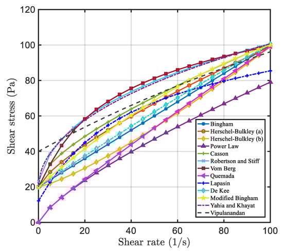 The (one-dimensional) model given in Equation (2) indicates a linear relationship after the initial yield stress is reached. However, this is not an accurate model for the non-linear behavior of many of the cement slurries [45]; in some cases, there is no clear relationship between the shear rate and the volumetric flow rate inside the pipe or annulus [46].