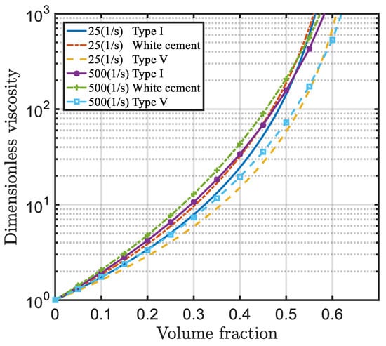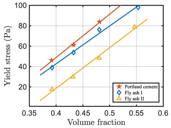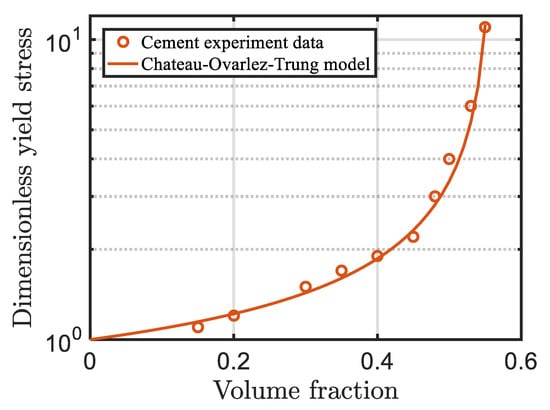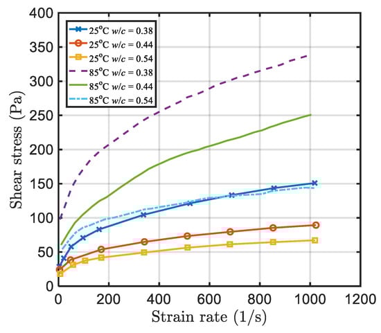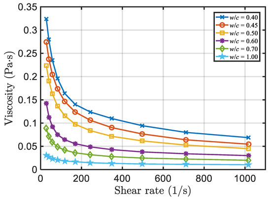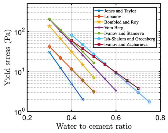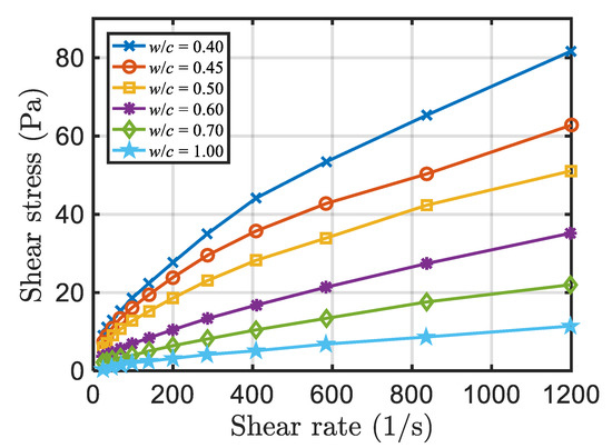 where a and b are constants, and for cement, their values were given to be 26.5 and 0.1, respectively (see Banfill [3]). The model considers yield stress, , explicitly, describing the flow behavior of cement at shear rates up to 380 s−1, and it also describes the yield behavior at zero shear rate. This model seems to be effective in describing shear-dependent behavior of cement pastes [45,58].