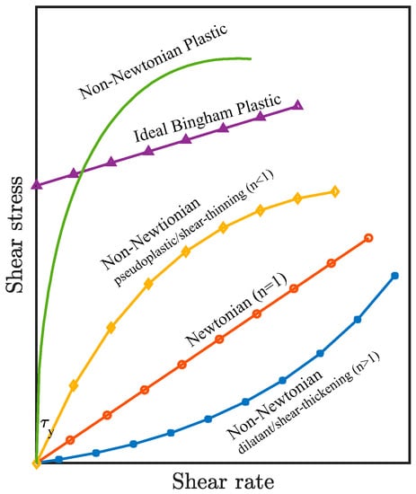 where is the consistency factor and n is the power-law exponent; when n = 1, the fluid is Newtonian; when n > 1, the fluid is shear-thickening, and when n < 1, the fluid is shear-thinning. In this formulation, one uses a critical shear rate instead of a yield criterion and this makes the numerical solution easier. For additional and interesting applications of the flow of a Bingham-type fluid, see White [50], and Lipscomb and Denn [51]. Mendes and Dutra [52] provide further insight into the viscosity of a shear-thinning (yield stress) fluids.