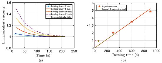 where the yield stress is independent of the structural parameter , and are the dynamic viscosities at when the structural parameter is 0 and 1. Equation (25) was checked and compared with experimental data and it was found to be a reasonable model to describe the behavior of different cements. For the Portland cement PTL 425 with water-to-cement ratio 0.40, the following values are suggested: = 12.1 Pa, = 43.6 Pa, = 87.6 Pa, a = 2100, b = 9.45, and c = 56.1 [58].
