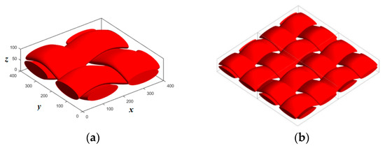 Carbon cloth GDLs are modeled using deterministic methods because of its woven cyclic pattern. Thus, a primitive cell (see in Figure 1) is complete to represent the minimum geometric information of reconstruction instead of generating the whole sample. These primitive cells can be attached unlimited times to form a bigger carbon cloth GDL at the required dimensions. Therefore, it is possible to overlap several layers to form a thicker sample.