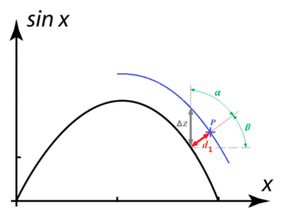 In order to convert the difference between the ordinates of two points on the same abscissa of two curves into the vertical distance between the two curves, we introduce a correction coefficient ε (see in Figure 2, ∆z is the difference between the ordinates and d1 is the vertical distance between two curves):