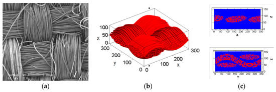 Images of carbon cloth GDL samples. (a) SEM image of carbon cloth GDL [25]. (b) The single-fiber carbon cloth GDL and (c) slices of the reconstructed model.