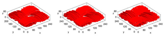 According to Salomov’s paper [24], the calculated porosity of his carbon cloth reconstruction model is 0.6892, which is close to the experimental value. Based on the carbon cloth reconstruction method proposed in Section 2.3 and authors’ previous studies, the carbon cloth structure parameters in Table 1 are taken as input, and constructed 15 different carbon cloth samples for modeling. Three samples are chosen from the 15 reconstruction results and are shown in Figure 5. It can be seen that the structure of the carbon cloth sample is a regular woven-type, and the randomness of the fiber distribution is embodied in the elliptical bundle.