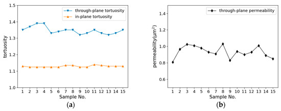Figure 6a,b are plotted from the calculated values of tortuosity and permeability of these 15 samples. The fluid inside the GDL is driven by a pressure gradient along the z-direction. It can be seen from the figure that the tortuosity and permeability of the 15 carbon cloth models vary within a certain range. Table 2 shows the average of these 15 calculations and the values calculated by the Tamadakis and Robertson equation and the Koponen equation. The through-plane tortuosity and permeability calculated by the formulas are slightly different from the calculated value of the model. Considering that the difference is so small, the calculated value of the model can be approximated to be consistent with the formulas.