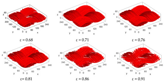 where ps and pb are the porosity of the single fiber and the bunched fiber sample of carbon cloth GDL respectively. The porosity is the ratio of the number of all zeros and all elements for 3D binary array, e is the area proportion of all circles and ellipse. The generating time of bunched fiber is obviously much less than the single fiber model, so Equation (7) can be used to calculate ps quickly to study the effect of structural parameters on porosity of carbon cloth GDL.
