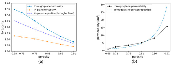 Figure 8a,b are the calculation results of the tortuosity and permeability of the 3D numerical samples of carbon cloth with different porosities. Figure 8a shows the change of tortuosity with different porosity values. In order to ensure a smaller error, each porosity value was used to stochastically constructed six different samples for calculation, and then compared the average values in both through-plane and in-plane directions. It can be seen from the figure that as the porosity increases, the tortuosity along through-direction decreases gradually, same as the Koponen equation, but only a slight decrease along in-plane direction. The reason is that the random distribution of fibers has a great impact on the through-plane direction of carbon cloth, which makes the pore size and pore distribution characteristics between each fiber inconsistent, and it also affects the pore diameter curvature inside the structure. In the range of 0.71–0.86, the tortuosity along through-plane direction decreases greatly, which indicates that the degree of twists of the mass transmission paths on through-plane direction is gradually decreasing. However, when the porosity increases to more than 0.86, the pore structure similarity is higher due to the significant decrease of the fiber numbers and make the tortuosity is almost unchanged.