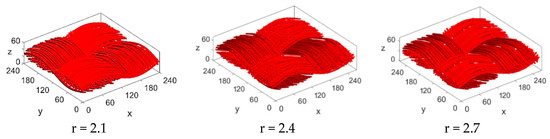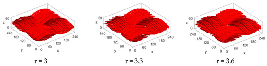 Figure 9 shows some 3D visual samples of stochastically reconstructed carbon cloth with different fiber radii. When the other parameters are constant, as the fiber radius increases, the number of fibers contained in the bundle decreases, and the fiber distribution becomes sparser. Compared with the obvious change of the carbon paper model, the regularity of the carbon cloth fiber distribution makes the visual effect of the model be similar, and the change of the pore structure is mainly reflected in the fiber bundle.