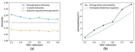 Calculated (a) tortuosity and (b) permeability of models with different fiber radii.