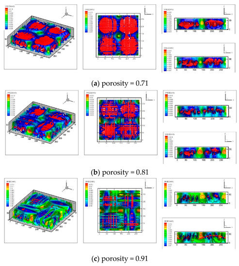 The velocity distribution of fluid in the porous medium can reflect the penetrability of the medium. To drive the fluid flowing, inlet and output pressure boundaries are applied. Steady water flow in the reconstructed carbon cloth is simulated by applying a constant pressure gradient between the bottom and top along z-direction and the bounce-back method is used. Figure 11a–c shows the three-dimensional velocity distributions in the reconstructed carbon cloth GDLs with different porosities. It can be seen that due to the anisotropy structure of the carbon cloth, the velocity field in it is complicated. The velocity distribution show that the main flow paths were through larger pores because of their less flow resistance. The flow of water was more concentrated at the pores formed by the overlap of fiber bundles, where the velocity was much larger. As the porosity increases, the pore space between the fiber bundles increases correspondingly, and the velocity distribution tends to be uniform. However, for carbon cloth GDL with the porosity of 0.91, the carbon cloth structure is difficult to form, water flow tends to accumulate in the pores due to the excessive porosity. Therefore, for better drainage and avoiding flooding, a porosity of 0.81 is more suitable.