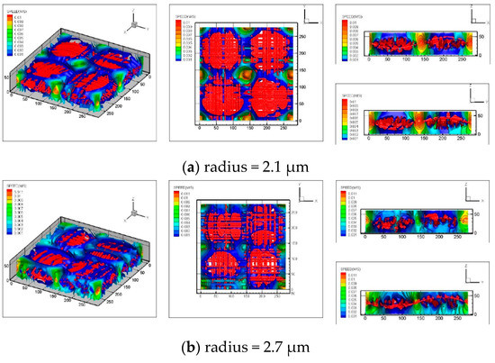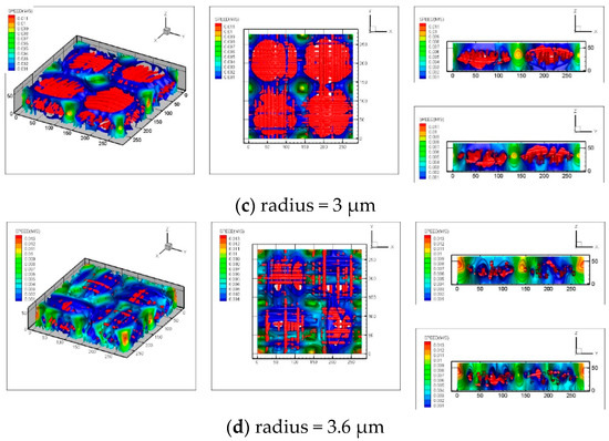 Figure 12a–d shows the three-dimensional flow fields in carbon cloth GDLs with different fiber radii. As shown in the figure, as the radius increases, the pore space in the carbon cloth increases correspondingly, and the velocity distribution becomes more uniform. For the carbon cloth GDL with the fiber radius of 3.6 μm, the pore space is too large. Water tends to accumulate in the pores and the entire GDL is immersed. To avoid such immersion, a fiber radius of 3 μm or slightly more than 3 μm is optimal.