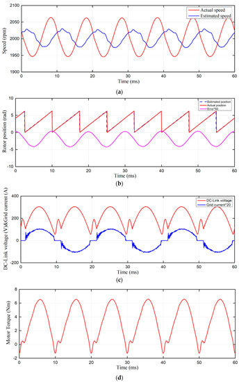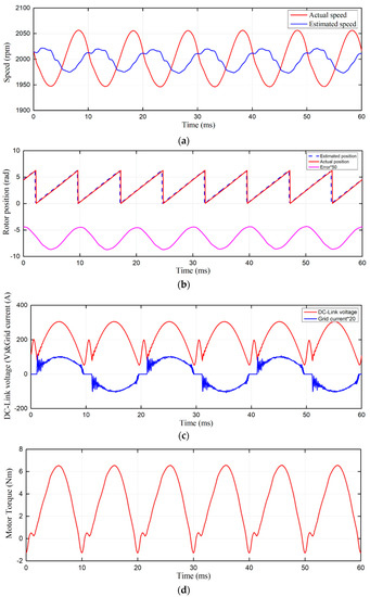 Besides, on the basis of Equations (7) and (9), the torque and speed of the motor consist of a DC component and an AC component which fluctuate with twice the input voltage frequency. As shown in Figure 3, the phase delay time is about 4 ms, while the estimated speed amplitude is only half of the real speed. The actual speed cannot be tracked well enough. The phase delay, amplitude decay, and waveform distortion of the estimated speed will generate harmonic components in the grid current, which is undesirable for a small DC-link capacitor drive system. Furthermore, the position estimate error also contains a steady-state error and a dynamic error, which leads the performance of the sensorless control to degrade. In order to solve these problems, the dynamic performance of the SMO should be improved to meet a wide range of frequencies.