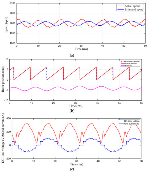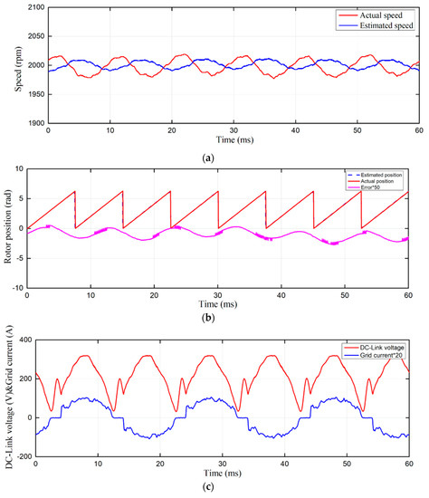 The average torque is 3.2 Nm; all of these simulations and experiments were at 3.2 Nm and 2000 r/min. Detailed analysis of the results is illustrated as follows. Figure 15 and Figure 16 show the simulation and experimental results for the conventional SMO estimated method. The red curves are actual speed and position of the motor shaft, while the blue curve is the estimated speed and position. Obviously, the motor speed was sinusoidal, with two times the grid voltage frequency, and the estimated speed delay to the actual speed was about 3 ms, so that the position estimated error was also sinusoidal and changed from −8° to −5°. Under a low estimation bandwidth, the amplitude was only half of the actual speed, and the bandwidth of speed estimation was low. On the grid side, the power factor was 99.48%. In Figure 13, the grid input current oscillates when crossing zero, causing higher harmonics than experimental result. In Figure 15c, the grid input current is smooth, because the hall sensor and low pass filter (RC) shown in Figure 13 filter out a lot of higher order harmonics, such as the switching noise of IGBT. The distribution of the harmonics complied with the simulation result.