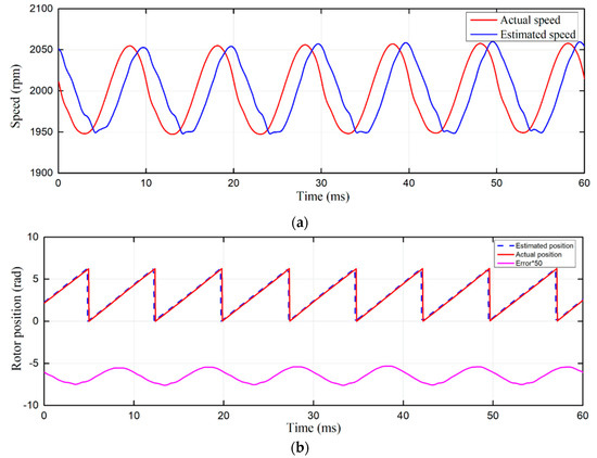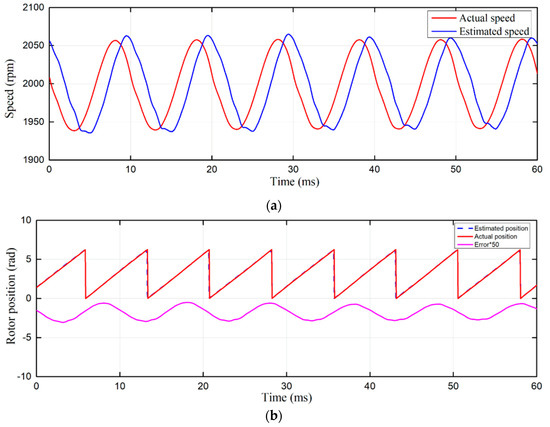 To verify parameter robustness of the proposed control method, the observer parameters were changed to simulate variation of the motor parameters. As shown in Figure 23, the resistance decreased 25% and inductance increased 10%. When the observer parameters vary, the observer and estimator can operate stably, and the position as well as speed estimations do not deteriorate visibly. That is to say, the proposed control system has a good robustness to the parameters.
