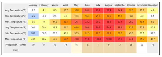 The province of Diyarbakir that is located in the southeast part of Turkey (Figure 1) belongs to the hot-dry region in the classification of climates, and in this region the summer seasons last longer than winter seasons as can be seen via Figure 2 [13,14]. In addition, July is the warmest and January is the coldest month. The average air temperature is 27.5 °C and the average temperature measurements per month are tabulated in Figure 2 [15].