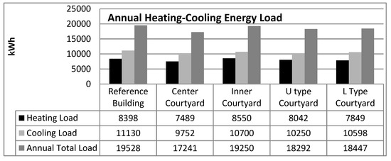 The courtyard building forms, which are frequently used in traditional Diyarbakır houses, were formed by adiabatic masses. In Diyarbakır, which is located in the hot-dry climate region, it was determined that the annual cooling load expenses are higher than the heating load expenses in all forms of construction. For this reason, it was obtained as a result of the analysis that the annual cooling load in the middle courtyard plan type decreased compared to the reference building. Moreover, when the examined building forms were examined, it was found that the cooling load expenses due to the shadow effect reduced. In addition, the building form that would minimize the total cooling load per year was found to be the plan type with a central courtyard. When total annual heating load expenses are compared, annual heating loads increase in inner courtyard building form, while other building forms decrease in values compared to the reference building. As a result of the analysis, it was determined that the optimal structural form was the central courtyard plan type among the heating load values, and also the L type courtyard type had similar values. When the total yearly heating and cooling load values are compared with the reference building, in other words, when the reference building which is not exposed to any shadow effect and the shadow forms with adiabatic building masses are compared, it is found that the optimum form regarding energy performance is the central courtyard building type (Figure 6).