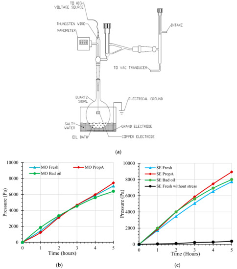Illustration of experimental simulation of low energy discharges and change in pressure with discharge time: (a) setup to simulate low energy faults; (b) for mineral oil; (c) for synthetic esters.