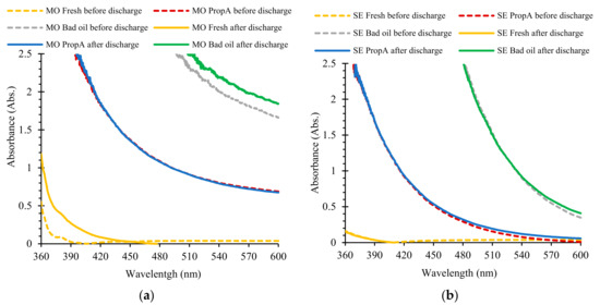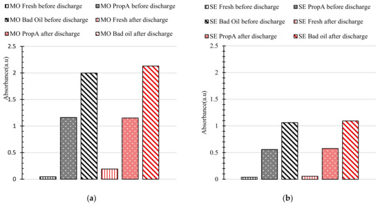 Change in absorbance at different aging conditions for before and after discharge: (a) for mineral oil; (b) for synthetic esters.