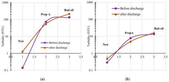 Change in turbidity of liquids at different aging conditions for before and after discharge: (a) for mineral oil; (b) for synthetic esters.