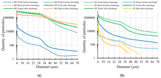 Change in number of particles at different aging conditions for before and after discharges: (a) for mineral oil; (b) for synthetic esters.