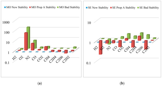 In order to have a proper interpretation of the changes, it was decided to plot p.u. values on a logarithmic scale. For mineral oil, there is a huge increase in O2 with aging. The quantity in ppm of O2 is increasing 134 times from a new to bad class liquid under the influence of low energy electric faults. There is also an increase in N2 of almost seven times. The changes in other gases go from 0.8 to fewer than two times. According to Henry’s law, the amount of gases dissolved in mineral oil are dependent on the partial pressure of existing gases above the surface. The degree of degradation of the liquid submitted to low energy discharge is not affecting as much the high energy discharges. The gassing tendency of mineral oil is noticed to be much lower than that of synthetic ester. There is a direct relation between the aromatic molecules and the gas absorbing effect [6]. The increase of oxygen is mainly due to breakage of chemical bonds associated with mineral insulating oil [17]. The trending of the fault gases with aging factors as per the Duval’s triangle and Duval’s pentagon methods is presented in Figure 7. The nature of fault types is noticed to be similar for both SE and MO but with different intensities. For both SE (non-mineral oil Duval triangle 3) and MO (Duval triangle 1), the faults are identified at the border of PD-T1 and DT [18]. Fault gas analysis from the Duval’s Pentagon method for synthetic esters is indicated D1 for fresh and Prop. A, which is low energy discharge (including spark type). For the bad class, D2 (high energy discharge fault) fault condition is obtained. This is because of the high concentration of conducting particles in the fluid of bad class that allowed more intensity of discharge [19]. Duval pentagon for mineral oil revealed PD (Partial Discharges) and S (Stray gassing of liquid at 120°C and 200°C) for Prop. A and bad class, respectively [20].