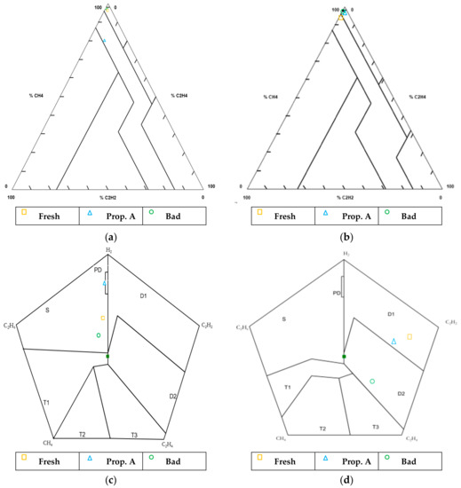 Representation of fault gasses in Duval’s triangle and Duval’s pentagon for mineral oil and synthetic ester at different aging factors: (a) Duval’s triangle for mineral oil; (b) Duval’s triangle for synthetic esters; (c) Duval’s pentagon for mineral oil; (d) Duval’s pentagon for synthetic esters.